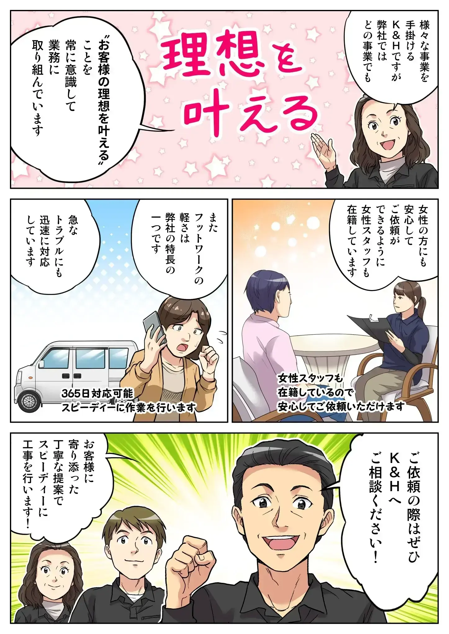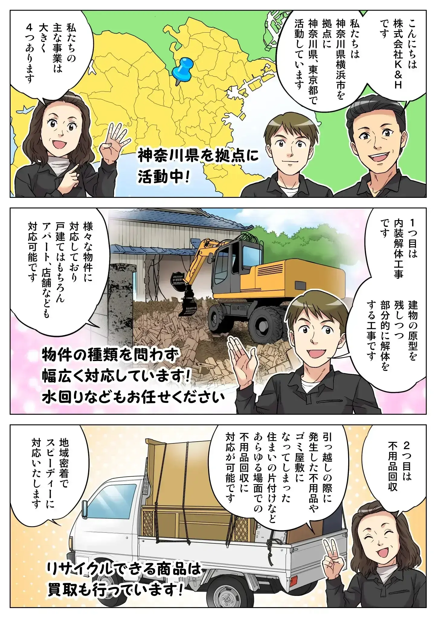 株式会社K&Hでは、解体工事・不用品回収・遺品整理・生前整理などを通じて、お客様の気持ちに寄り添った作業を心がけております。ご依頼くださったお客様が、頼んで良かったと感じていただけるよう、これからも社員一同誠心誠意作業に取り組んでまいります。