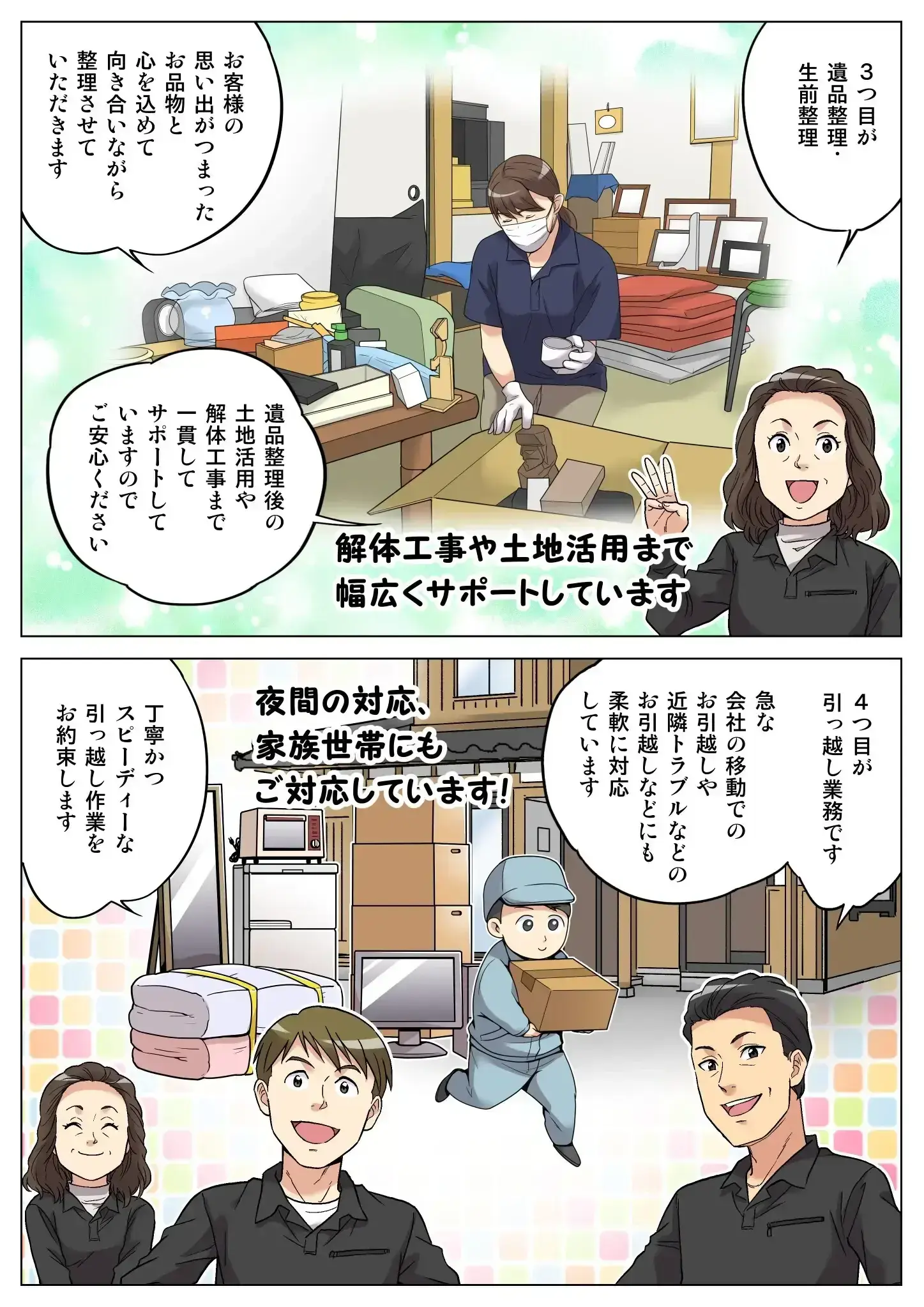 弊社の特長はフットワークが軽いことであり、最短即日相談が可能です。365日対応しており、ご相談や作業のご依頼に対し迅速にお応えいたします。急なご依頼であっても、まずはご連絡ください。お客様のお気持ちを最優先に考え、サービスをご提供いたします。